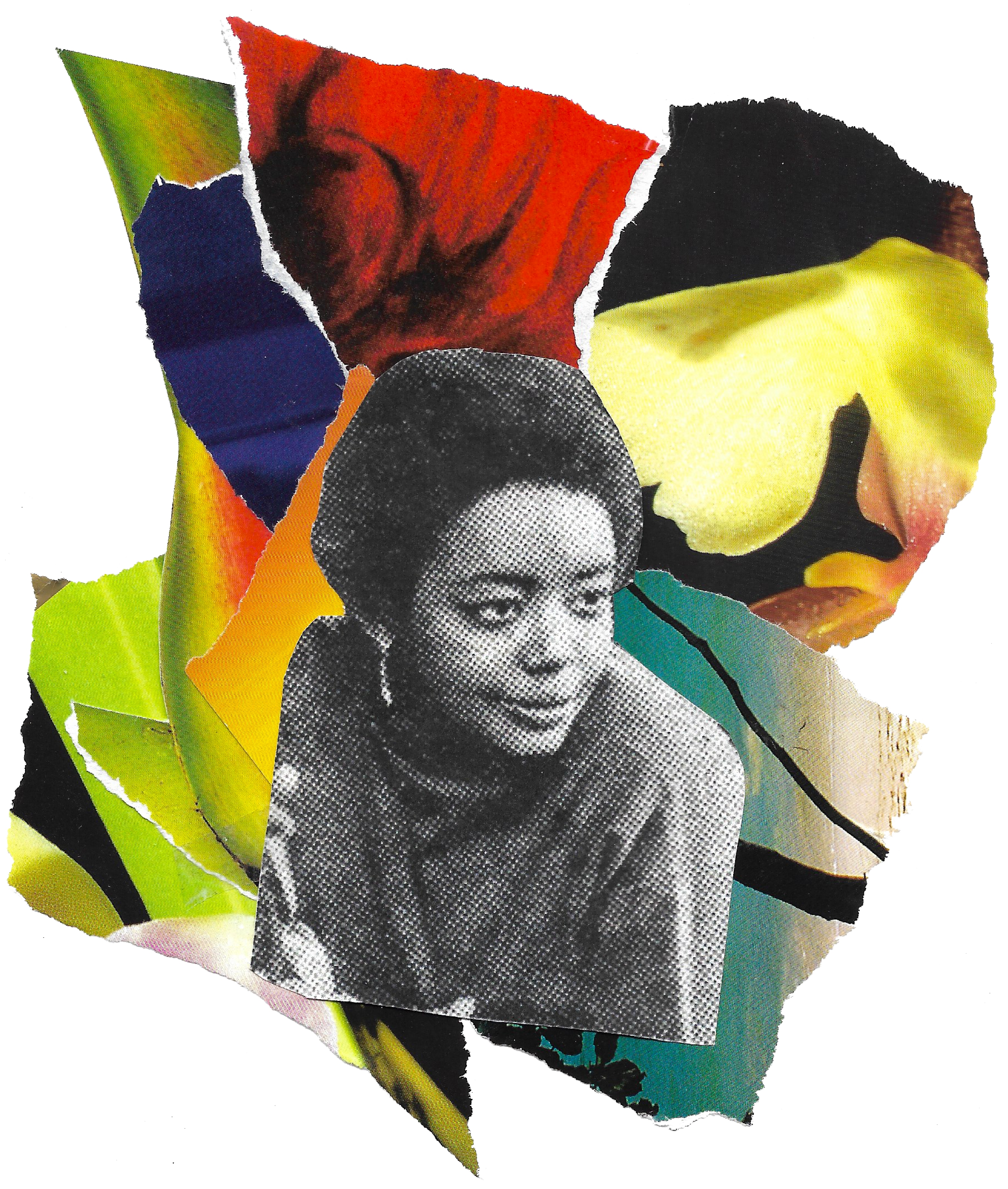 BLACK AND WHITE HEADSHOT OF bell hooks ON TOP OF A COLORFUL BACKGROUND.
